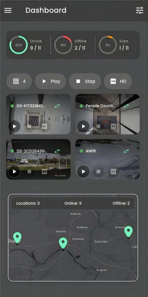 Aplikacija omogućuje administraciju lokacija i uređaja, a uključuje upravljanje kontrolama pristupa, kamerama i korisnicima. Posebno je korisna funkcionalnost neograničenog live-viewa koja omogućuje stalni nadzor s mobilnog uređaja. Također, postoji opcija izrade izvještaja o brojanju osoba, prolascima vozila (LPR), kontroli pristupa i drugim parametrima sustava.